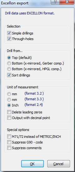 5. Export drill data (Excellon) by selecting "File -> Export -> Drill data -> (Excellon)...".